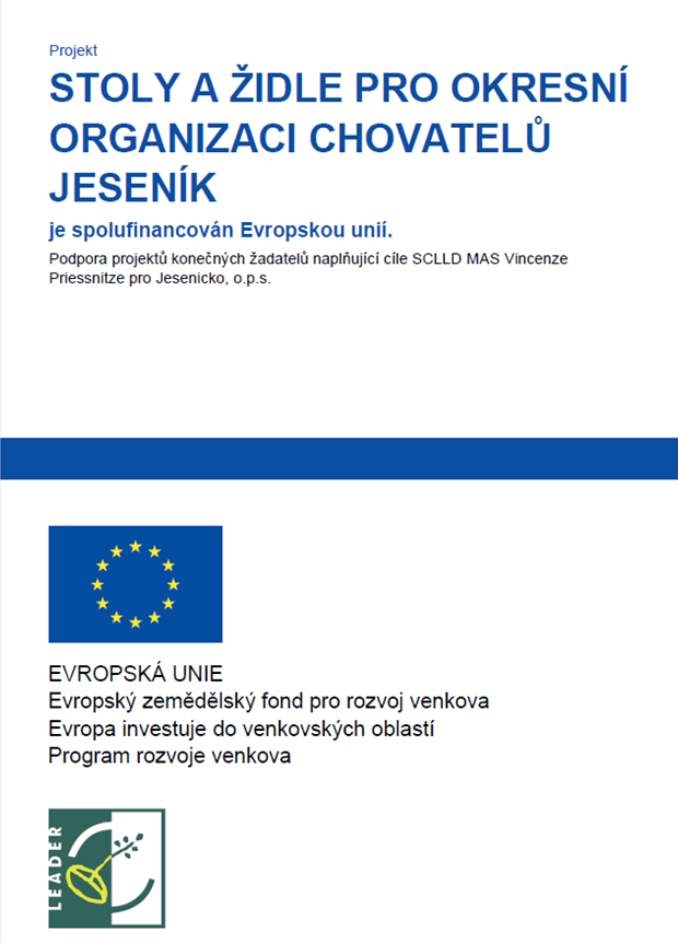 Státní zemědělský intervenční fond prostřednictvím místní akční skupiny MAS Vincenze Priessnitze pro Jesenicko o.p.s podpořil naši organizaci Českého svazu chovatelů, z.s., Okresní organizace Jeseník v rámci Programu rozvoje venkova dotačními prostředky ve výši téměř 44 tisíc korun na nákup nových stolů a židlí.